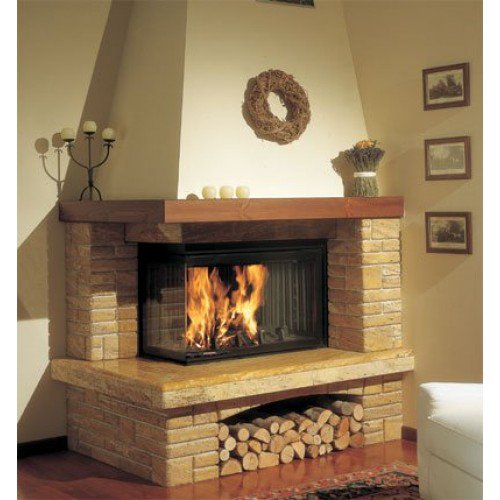 Этот угловой камин в стиле кантри компактен и не занимает много места в интерьере. Он изготовлен из бучардированного слегка состаренного желтого травертина, а его верхняя балка – из темного дерева. В качестве опции к этому камину прилагается банкетка 80х45 см.