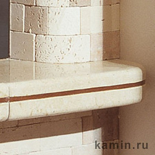 Облицовка из белого бучардированного камня со столешницей из полированного мрамора Rosso Alhambra. Балка, шпонированная орехом. Угловой камин, правый.