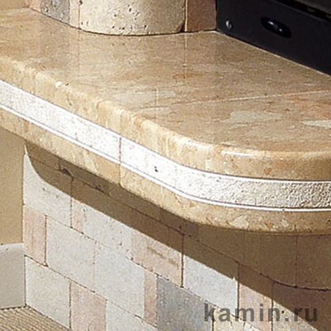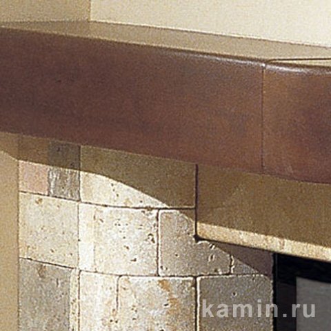 Камин из разноцветного травертина, уложенного мозайкой, открытый сбоку. Плита из мрамора Трани с сочетанием полированного и бучардированного. Возможен вариант из розового стонелита. Деревянная балка.