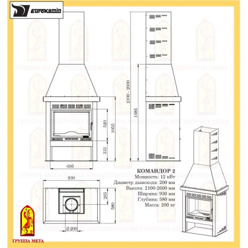 - Диам. дымохода: 200 мм